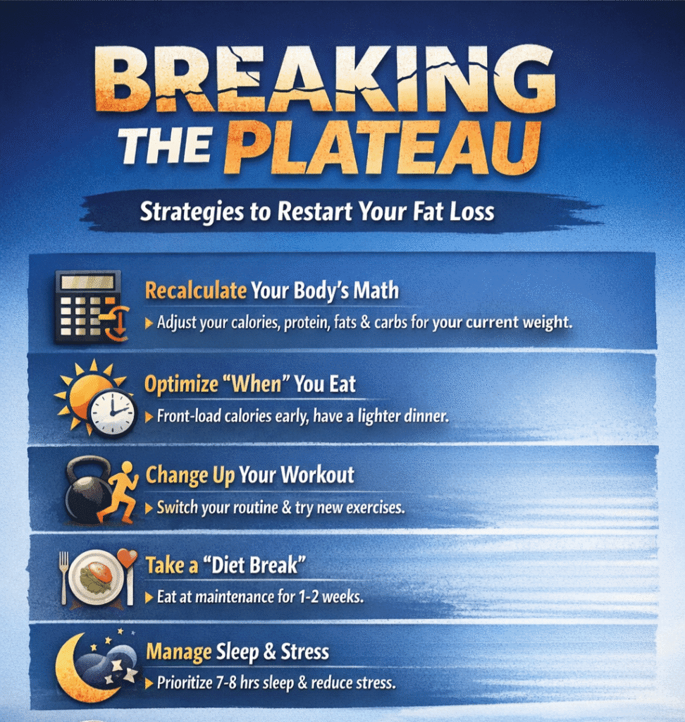 4. Take a Strategic “Diet Break”: If you have been in a calorie deficit for months to lose your initial 10-20kg, your metabolism may have slowed down, and hormones like leptin (which regulates fat burning) have dropped. Sometimes, to lose weight, you need to eat more. Taking a 10-to-14-day “diet break” where you intentionally eat at maintenance calories can reduce metabolic stress, replenish your glycogen stores, and reset your hormones. When you return to a slight deficit, your body will respond to fat loss again.